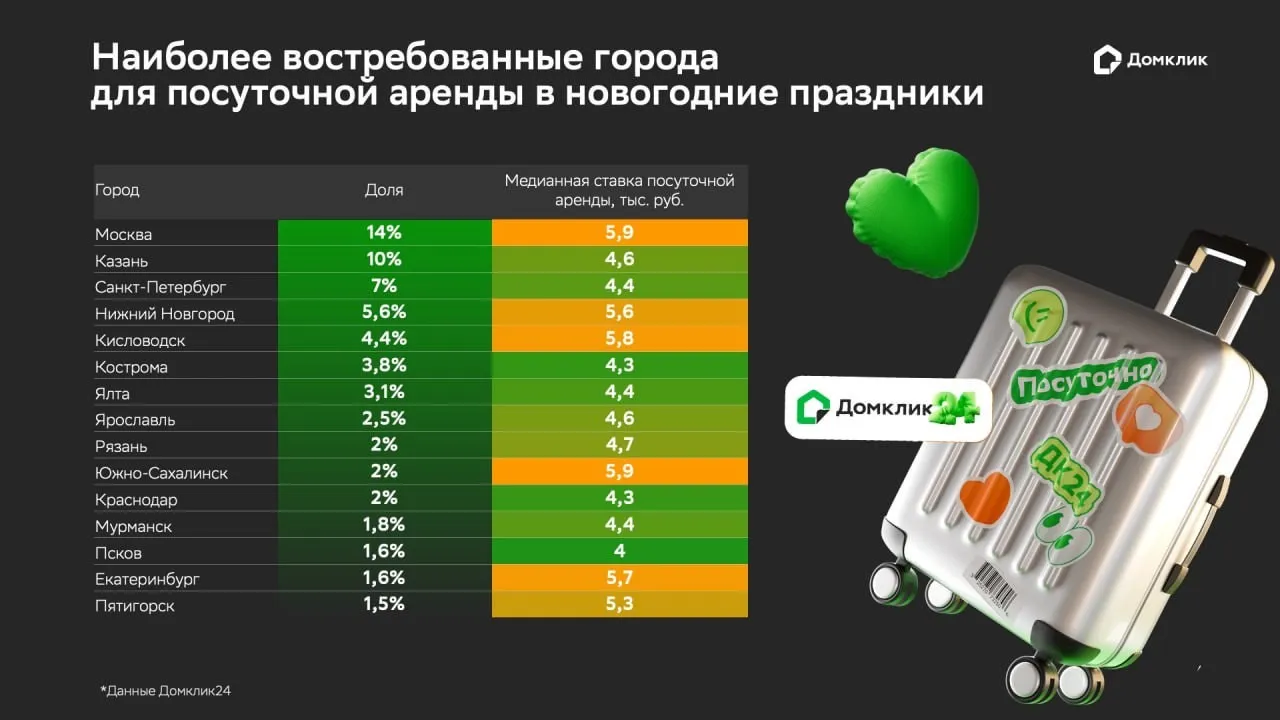 В расчёт принимались данные на 1 декабря 2025 года по квартирам, которые были забронированы через сервис Домклик24 на новогодние праздники.