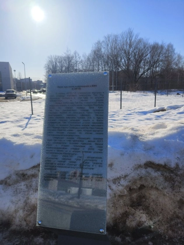 Сейчас главная новость — появление восьми табличек вдоль пешеходных дорожек. Они делают пространство более осмысленным и добавляют тому самому содержания, которого не хватало. Четыре таблички посвящены трагическим событиям сентября 2011 года и их последствиям, четыре — истории и достижениям клуба.