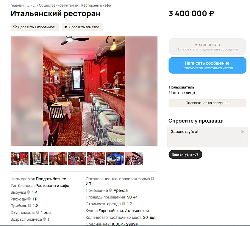По словам автора объявления, меню для ресторана составлял приглашённый бренд‑шеф из Италии. Собственники объясняют решение продать бизнес запуском нового проекта в другом городе и допускают, что действующую концепцию можно использовать как основу для небольшой сети заведений.