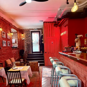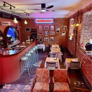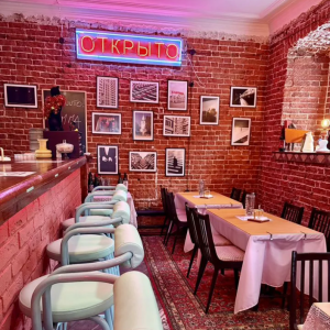В ресторане открытая компактная кухня, интерьер оформлен в ретро‑стилистике с отсылками к Италии и России. Дизайн, по информации продавца, разрабатывало зарубежное бюро. Посетители, как указано в объявлении, отмечают камерную и «артистичную» атмосферу заведения.
