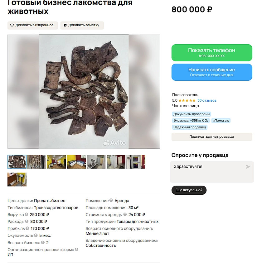 В Ярославле на популярном сервисе объявлений «Авито» появилось предложение о продаже необычного готового бизнеса по производству натуральных лакомств для домашних животных. Речь идёт о действующем небольшом предприятии, которое специализируется на сушёных вкусняшках для собак и кошек и уже имеет стабильный доход и растущие каналы сбыта.