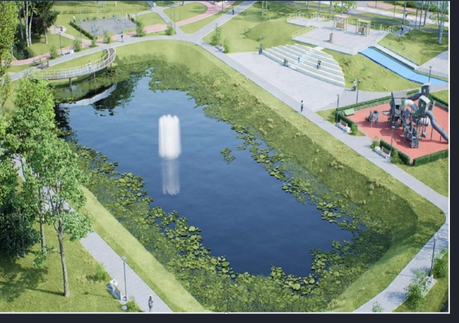 Для комфортного пребывания жителей и гостей планируется установка малых архитектурных форм, включая террасу-палубу у воды и перголы с защитой от солнца. Особое внимание уделено благоустройству прибрежной полосы: запланировано укрепление берега и ландшафтная организация пространства с безопасным доступом к воде. Для разных возрастных групп предусмотрены детская игровая площадка и спортивный комплекс, а центральным акцентом парка станет фонтан, выполняющий архитектурно-художественную и микроклиматическую функции. Завершением проекта станет модернизация наружного освещения и комплексное озеленение территории.