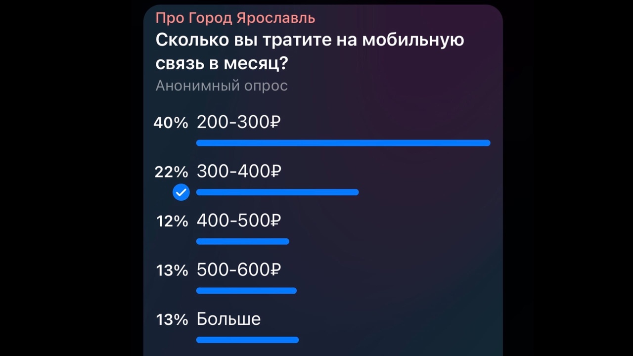 Про Город в своем телегам-канале провел опрос среди ярославцев о том, сколько они платят за мобильную связь. Как оказалось, большинство отдают за мобильную связь в пределах 200-300 рублей - 40% опрошенных, 147 голосов из 370. Еще 22% опрошенных выбрали вариант 300-400 рублей - это 80 человек из 370. За еще большие суммы - 400-500 рублей - проголосовало 12% опрошенных. Это 50 человек из опрошенных 370. Остальные 26% отметили, что платят за мобильную связь больше 500 рублей.