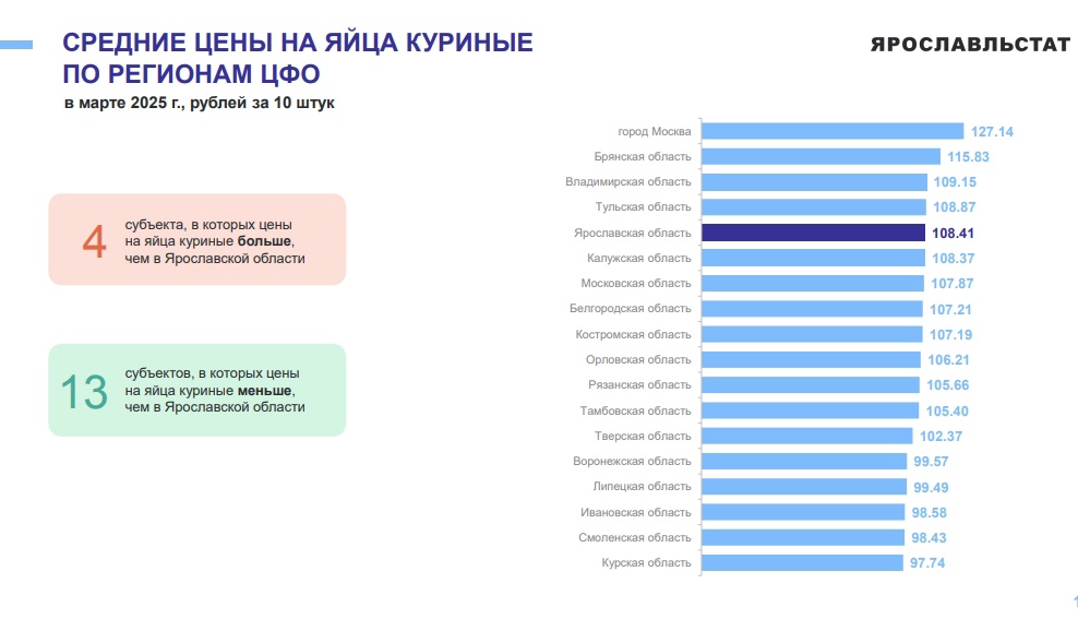 По данным Ярославльстата, сейчас десяток яиц в Ярославской области можно купить в среднем за 108.41 рублей.
