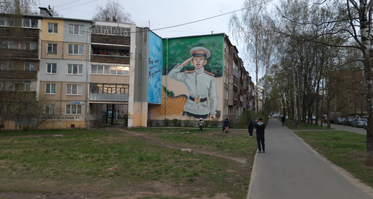На жилом доме в Брагино появилось граффити в честь Дня Победы с мальчиком в военной форме