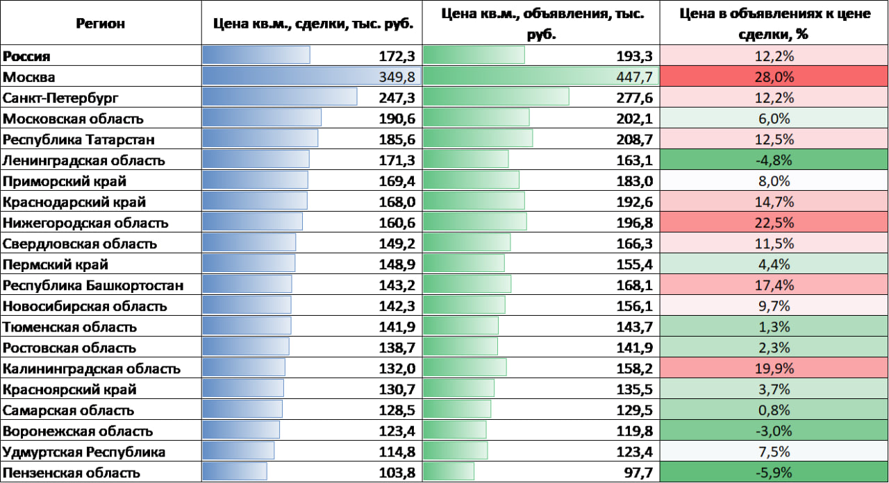 Лидерами по стоимости строящегося жилья остаются Москва (349,8 тыс. руб. за кв.м.), Санкт-Петербург (247,3 тыс. руб.), Московская область (190,6 тыс. руб.), Республика Татарстан (185,6 тыс. руб.) и Ленинградская область (171,3 тыс. руб.).