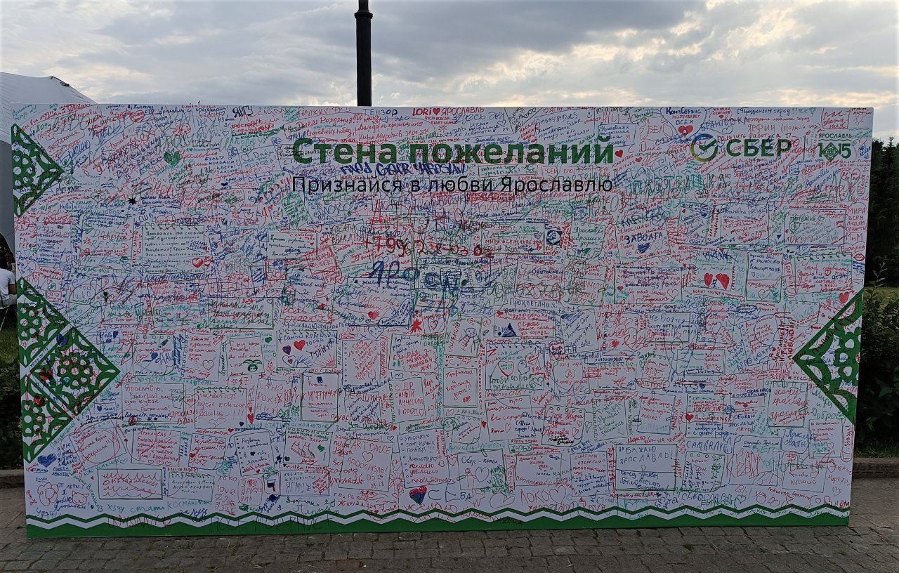 Отдельное внимание горожан и туристов привлекла Стена пожеланий «Признайся в любви Ярославлю», установленная на Стрелке. Каждый мог написать признания, благодарности, и поздравления любимому городу – уже к обеду вся поверхность стены была покрыта надписями.