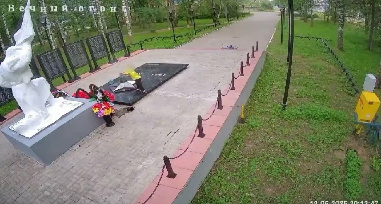На видео мальчик в желтой футболке подъехал к мемориалу на велосипеде, подошел к вазам с цветами и вылил из одной из них воду в огонь. С первого раза Вечный огонь не поддался, поэтому содержимое пластикового баллона тоже было вылито на огонь.