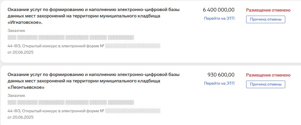 Ярославская "Служба городских кладбищ" отменила закупку на подряд по цифровизации двух кладбищ - Игнатовского и Леонтьевского. Закупки был размещены только 20 июня, а уже 24 числа заказчик их отменил. Такая информация появилась на портале "Контур.Закупки".