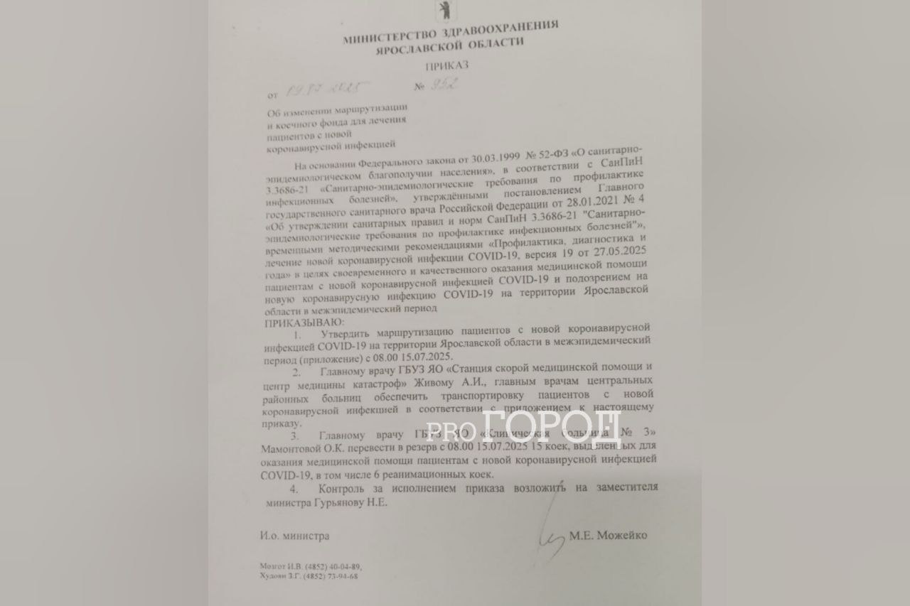 "Объявить режим временной приостановки (простой) с 15 июля по причинам, не зависящим от работодателя и работника, по должностям медицинских и не медицинских работников перепрофилированного стационара для оказания медицинской помощи пациентам с ковид-19 (15 коек), в том числе 6 реанимационных коек, до особых распоряжений министерства здравоохранения Ярославской области".