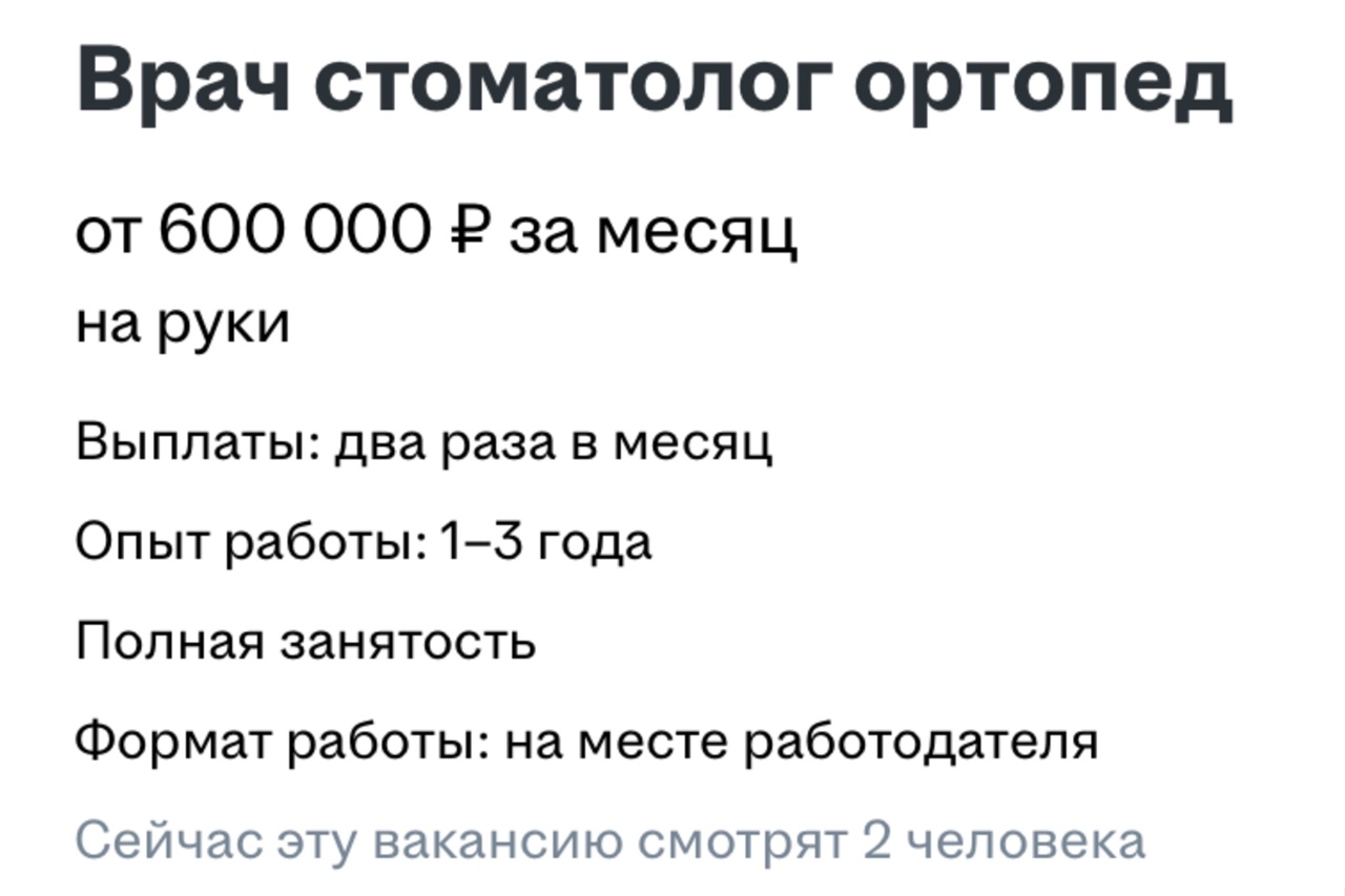 В Ярославле на сайте по поиску работы "hh.ru" частная компания опубликовала вакансию на должность стоматолога ортопеда.