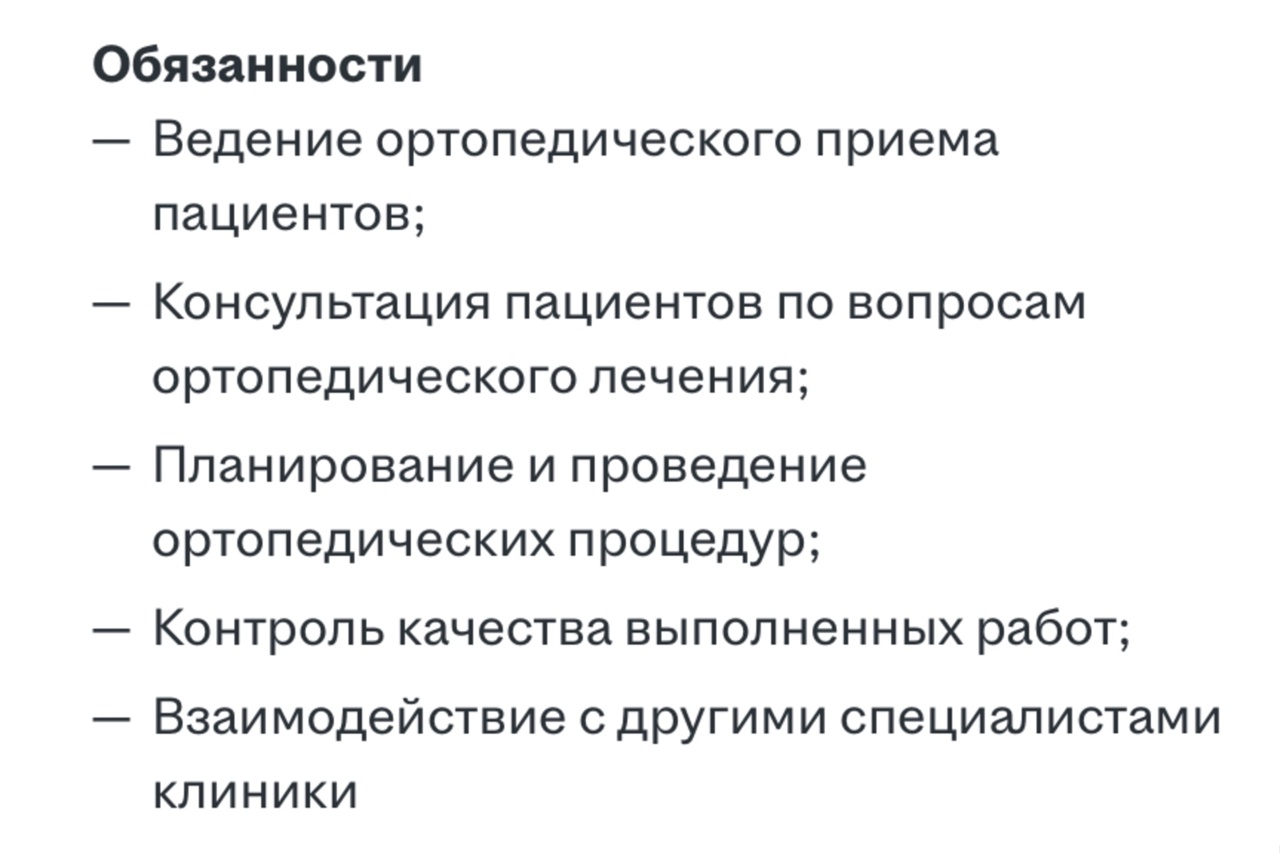 "Обязанности:ведение ортопедического приема пациентов, консультация пациентов по вопросам ортопедического лечения, планирование и проведение ортопедических процедур, контроль качества выполненных работ", - говорится в объявлении.