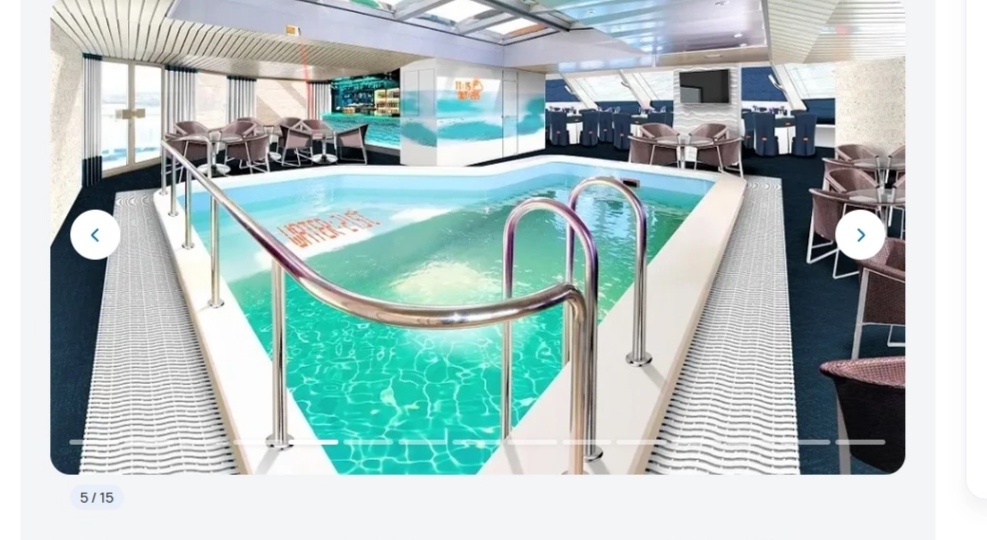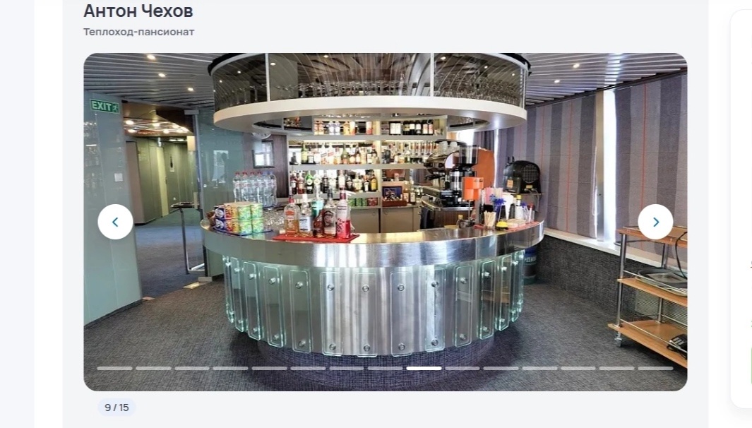 "Панорамные рестораны «Дядя Ваня» и «Чайка», 2 бара, сауна, парикмахерская, библиотека, детский клуб и конференц-зал. Еще одна отличительная особенность теплохода – крытый бассейн на шлюпочной палубе", - продолжают описание организаторы отдыха.