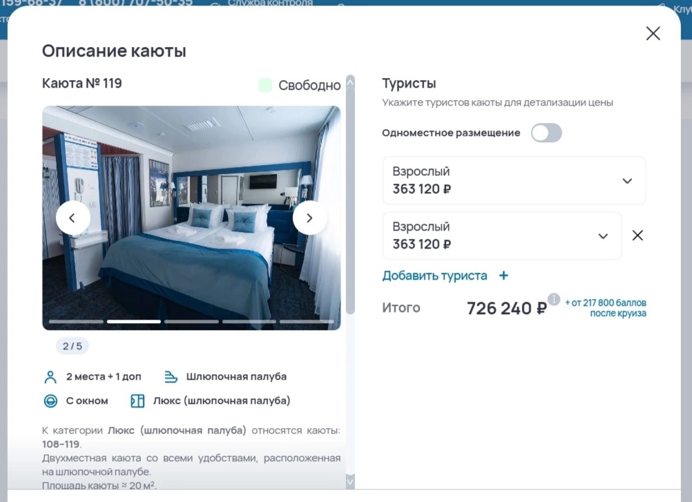 Отдых на таком теплоходе - удовольствие не дешевое. Так, каюта класса люкс обойдется во время двухнедельного путеществия в 720 тысяч рублей! Площадь каюты - 20 квадратных метров. В одной каюте помещается двухспальная кровать, на диване возможно размещение ребенка. Также есть ванная комната с душем.