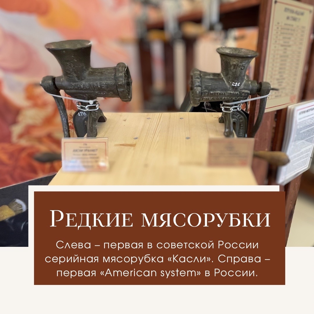 "В коллекции представлены самые первые, произведенные из чугуна и эмали мясорубки производства США и Германии, а также мясорубки, выпускавшиеся по заказу Минобороны СССР", - сообщают авторы экспозиции. Фото Мясорубки в музее | Ярославль.