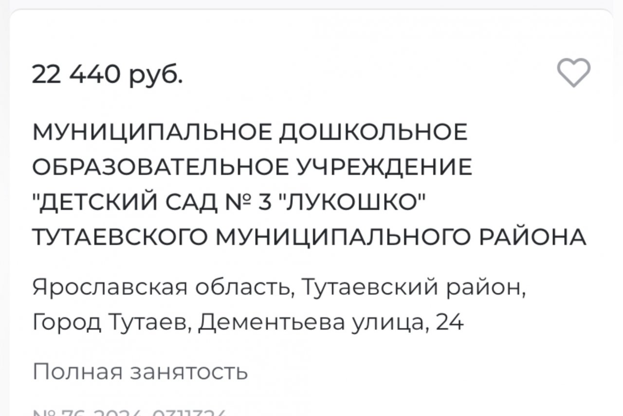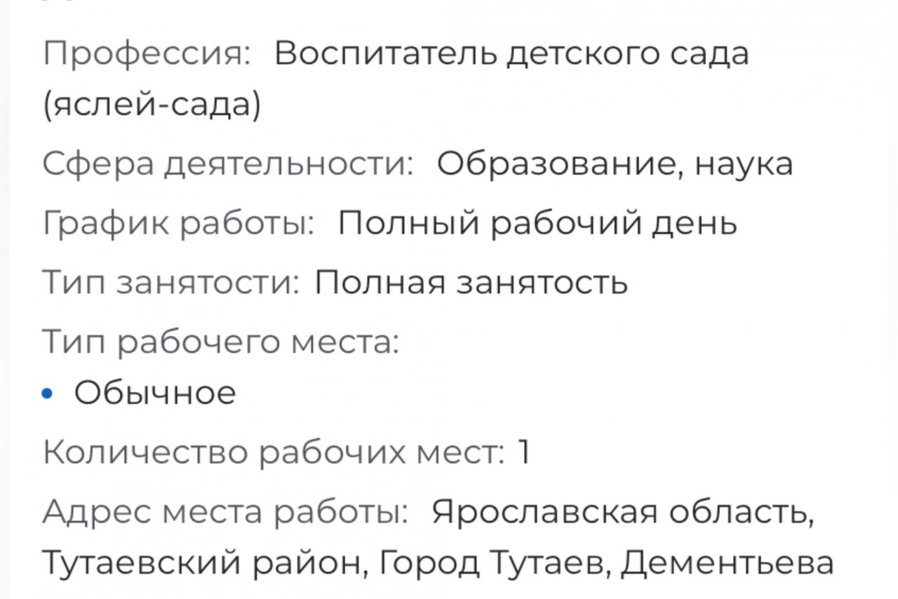 На должность воспитателя рассматривают человека с педагогическим образованием. Однако объявлении не говорится о том, что у кандидата должен быть опыт работы. Также там указано, что воспитатель за 22440 рублей в месяц будет работать полный рабочий день.