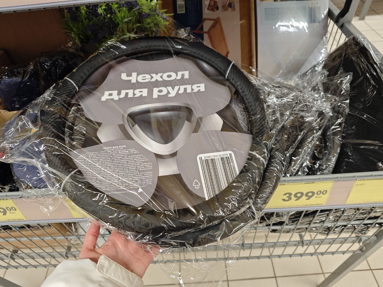 Чехол для руля автомобиля за 399 рублей. Материал - ПВХ. Диаметр - 38 сантиметров.