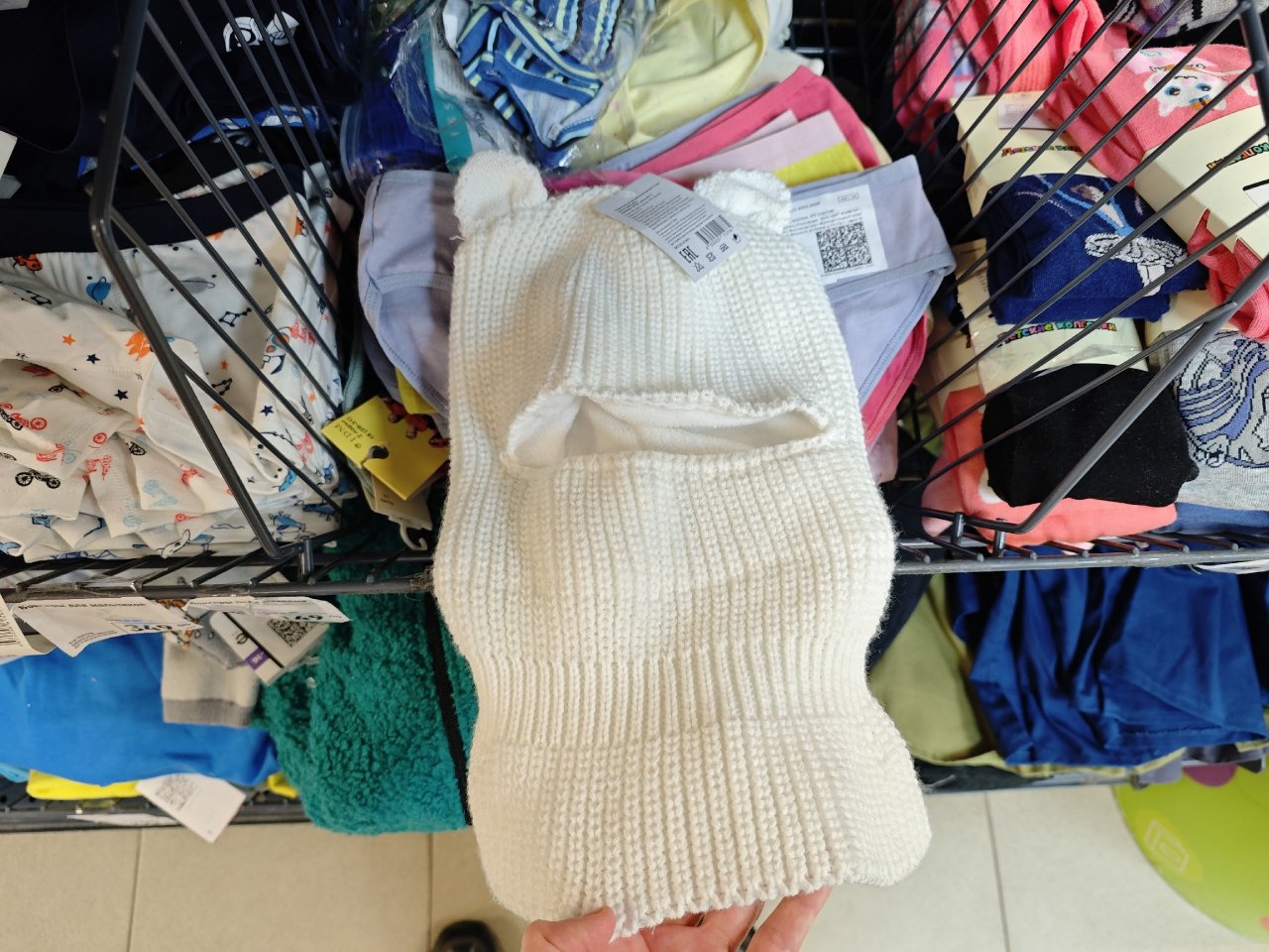 Шапка-шлем на ребенка. Материал - акрил, подкладка - полиэстер. Цены на детские шапки: от 249 до 349 рублей.
