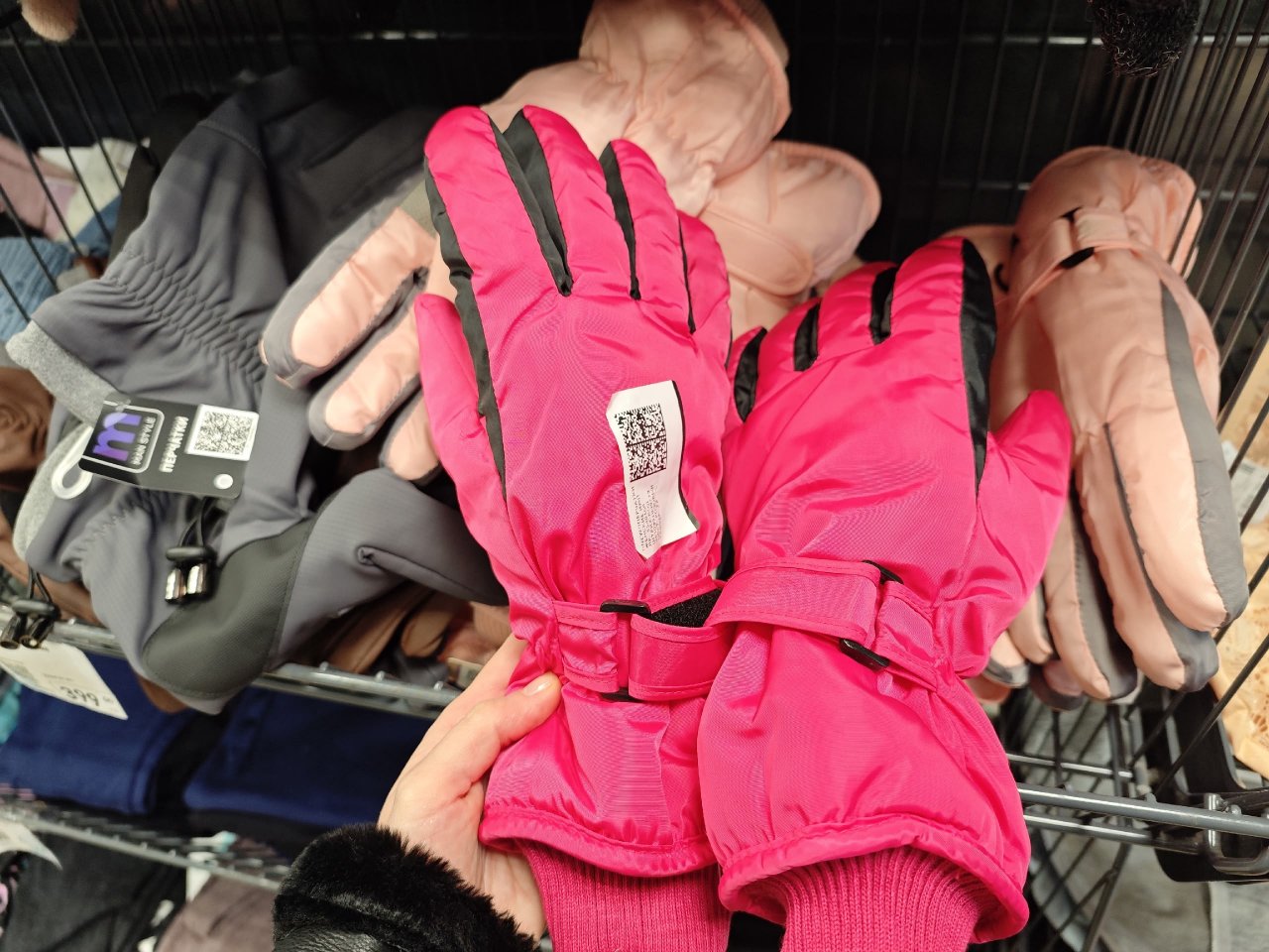 Женские непромокающие перчатки из полиэстера, цвета яркие. Цена - 349 рублей. Мужские будут стоит уже 399 рублей, цвета при этом нейтральные.