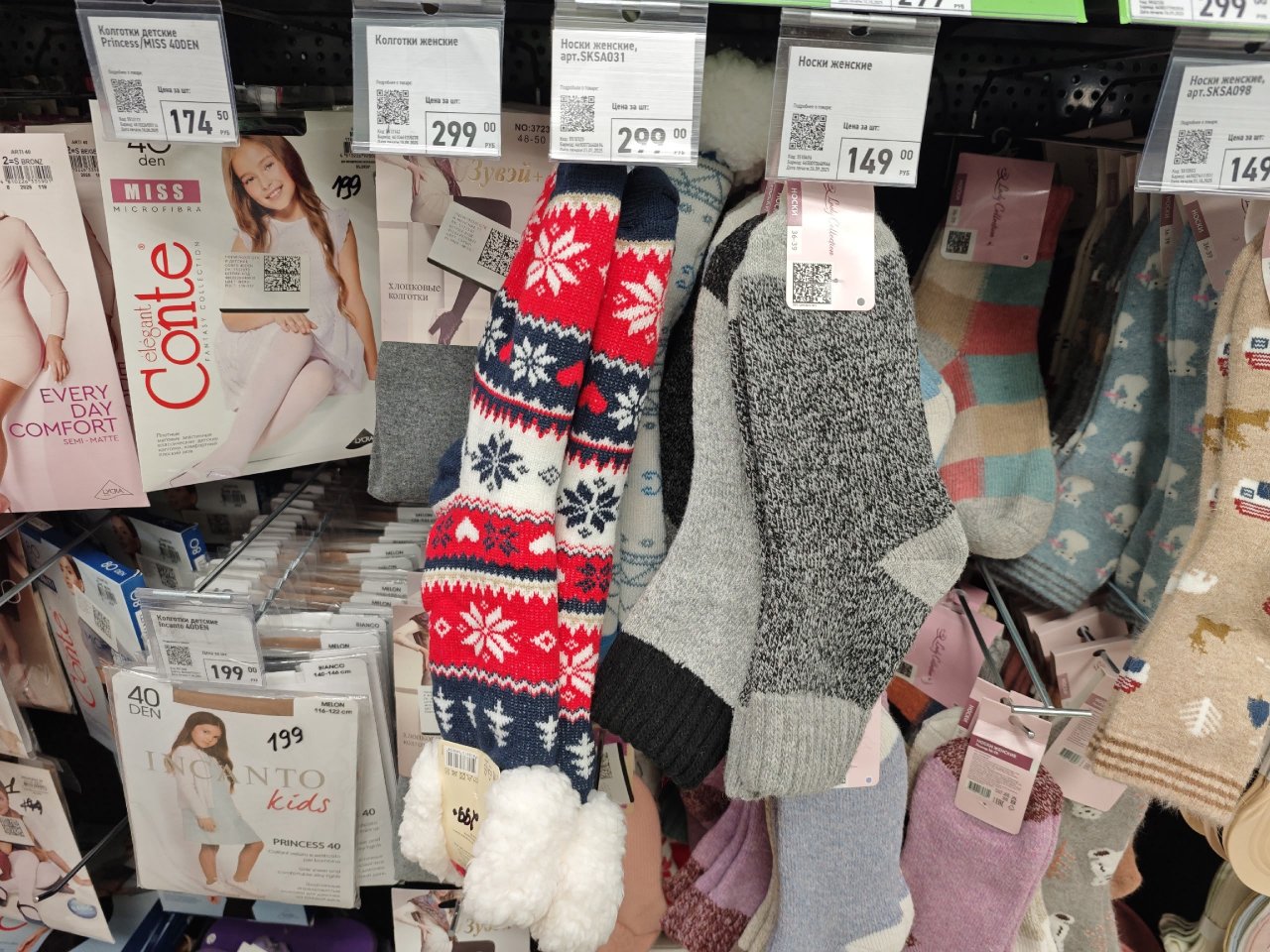 Носки новогодних расцветок. Состав: 49% акрил, 40% полиэстер, 8% вискоза. Цена: 299 рублей.