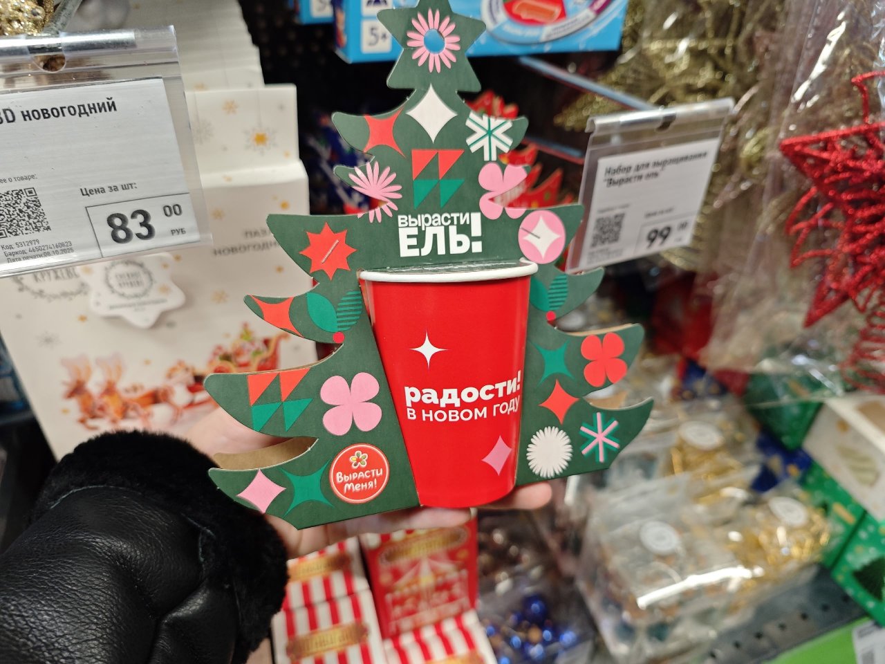 Набор "Вырасти ель!". В состав входят бумажный стакан, торфяные таблетки, семена ели и инструкция. Цена - 99 рублей.