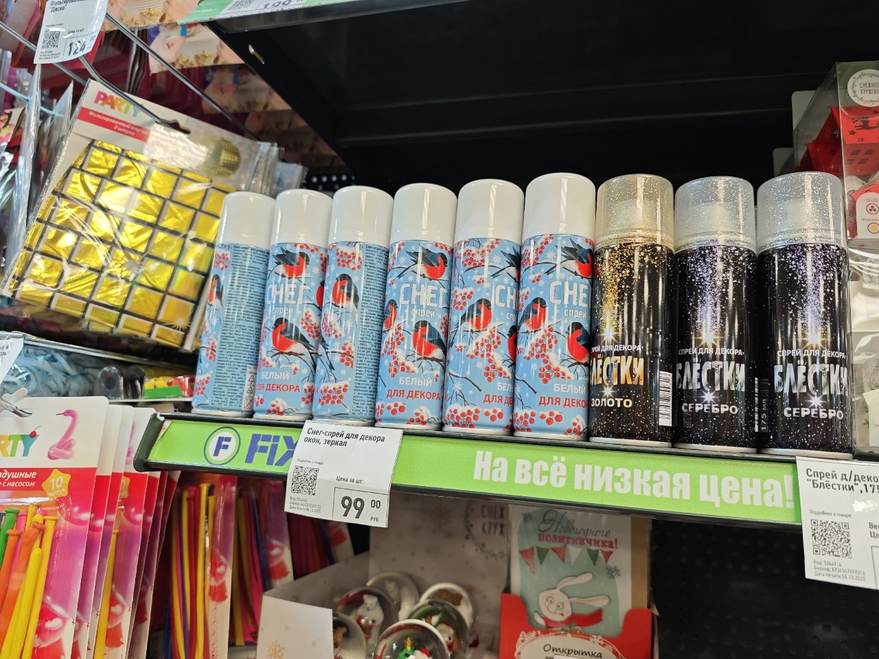 Снег-спрей для декора окон и зеркал. Емкость - 160 мл. Производители обещают, что он легко смывается. Цена: 99 рублей.
