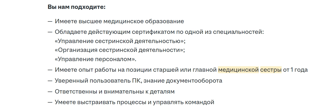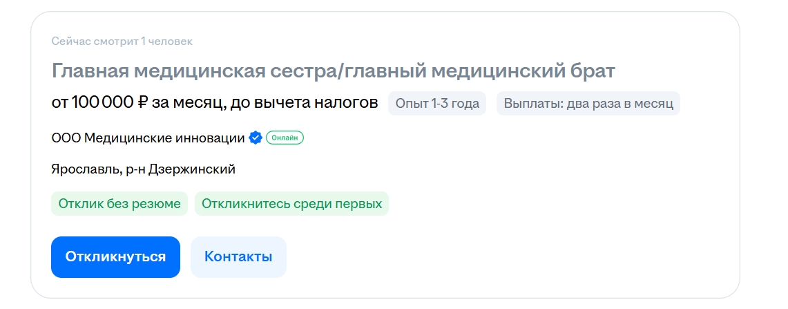 В Ярославле на сайте по поиску работы частная компания опубликовала вакансию на должность главной медицинской сестры.
