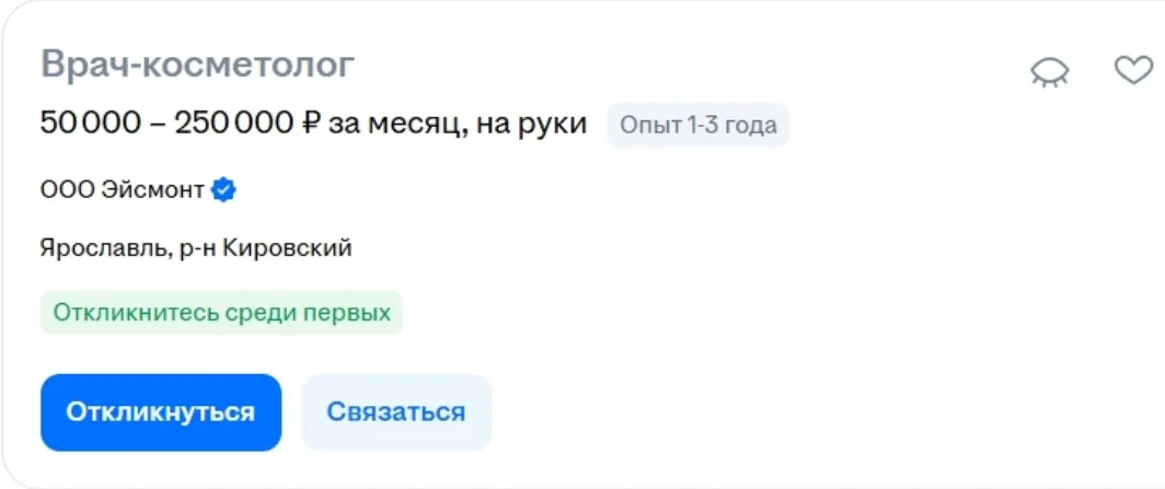 Одна из частных клиник ищет специалиста, которому будут платить от 50 до 250 тысяч рублей на руки.