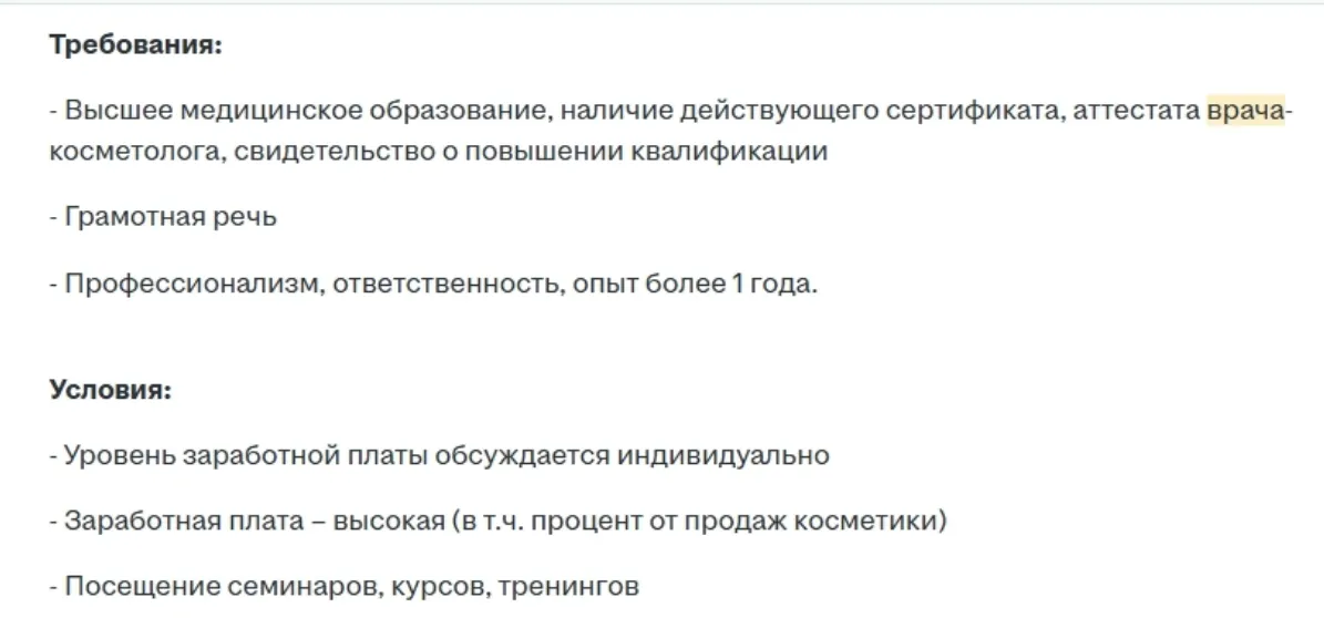 "В обязанности будет входить: - проведение первичного приема, диагностика кожи лица, составление плана лечения, проведение инъекций, аппаратная косметология, подбор ухода за лицом и телом на премиум космецевтике, эпиляция, массаж лица, назначение и продажа средств для домашнего ухода", - говорится в вакансии.