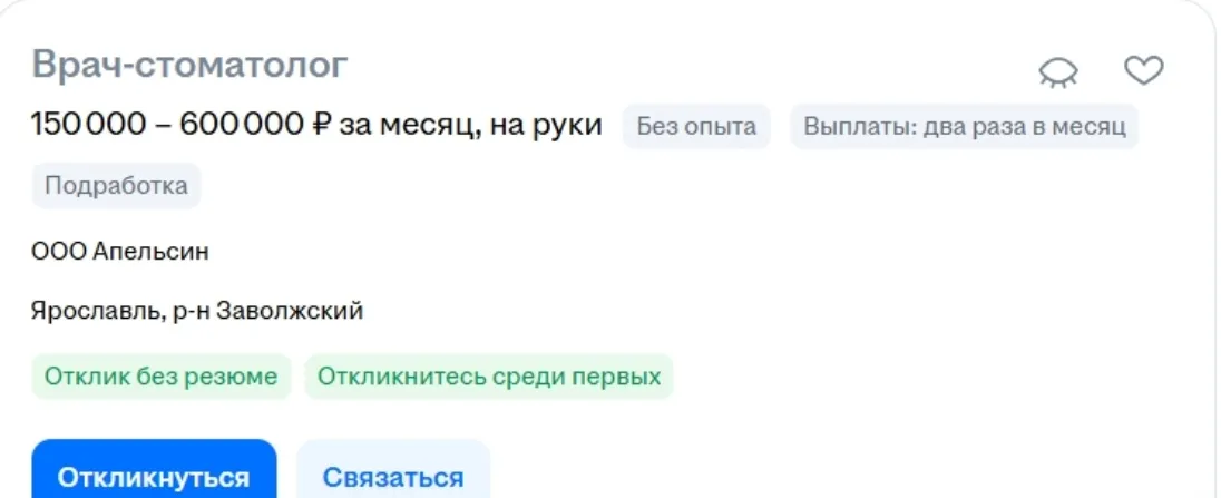 На сайте по поиску работы появилось объявление от частной клиники, в которой врачу обещают платить от 150 до 600 тысяч рублей на руки.