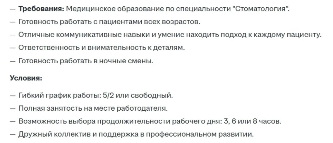 В тексте объявления указано, что ищут сотрудника, который готов работать с пациентами разных возрастов. При этом у кандидата может не быть опыта работы. Главным требованием является высшее медицинское образование по специальности "Стоматология".