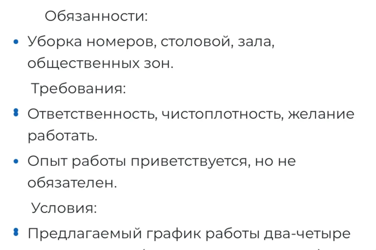 "В обязанности будет входить уборка номеров, столовой, зала, общественных зон", - говорится в вакансии.