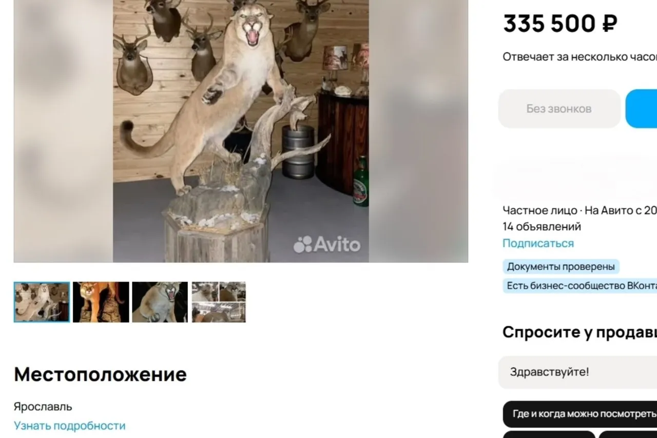 В Ярославле на сайте с объявлениями появился интересный товар. Так, в Кировском районе сейчас можно купить чучело горного льва за 335 тысяч рублей.