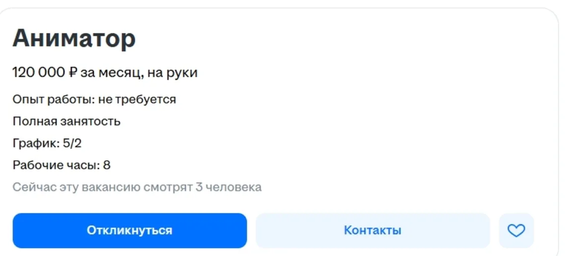 Будущему аниматору обещают зарплату до 120 тысяч рублей в месяц.