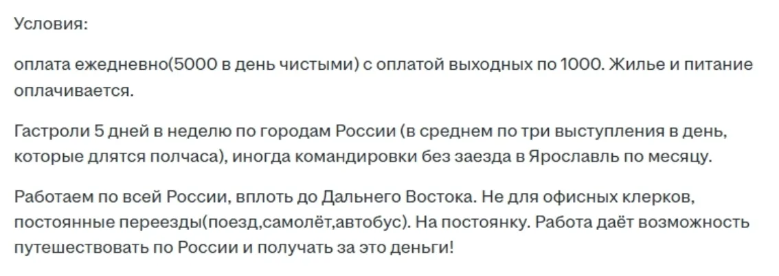 При этом отмечают, что будущий работник будет выступать на гастролях по городам России.