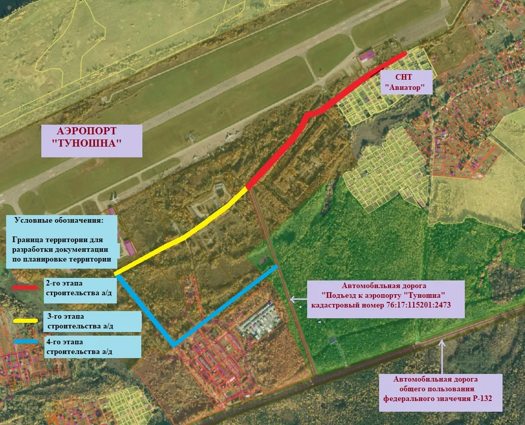 "Подрядчик принимает на себя обязательство на проведение комплекса работ по подготовке документации по планировке территории, разработке проектной документации по изменению границ земель, на которых расположены леса лесопарковой зоны, выполнению кадастровых работ по объекту: «Строительство автомобильной дороги «Подъезд к аэропорту Туношна» в Ярославском муниципальном округе Ярославской области (2, 3, 4 этапы)",- говорится в контракте