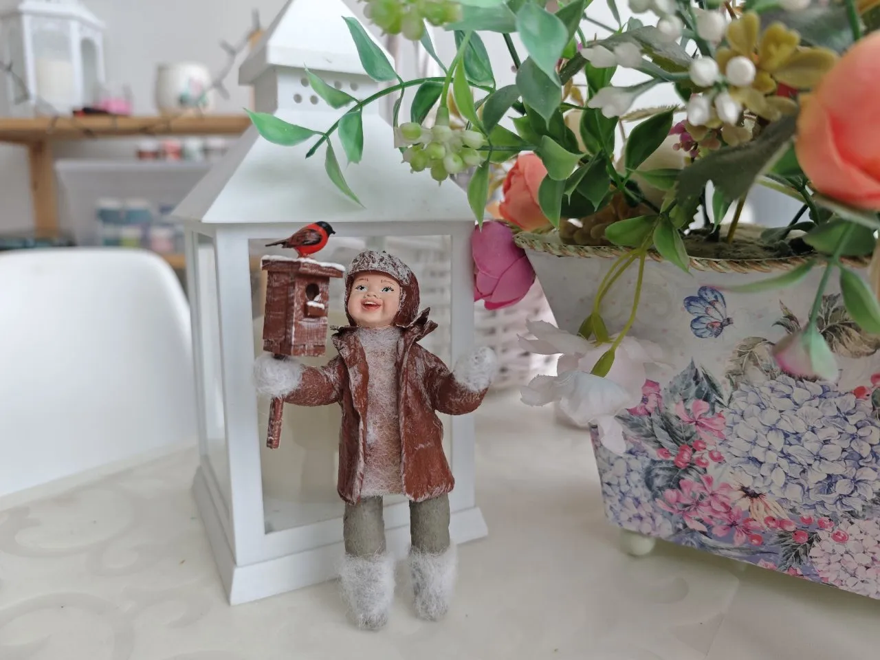 На столе перед Оксаной маленькая девочка из ваты чистит мандарин, еще одна малышка с удивлением рассматривает сосульку, а мальчик в заснеженной шапке радуется снегирю, вылетевшему из скворечника. Кажется, это не елочные игрушки, а живые дети - просто очень маленькие. Вот они сейчас оживут и побегут проказничать. Детали и эмоции каждой такой миниатюры можно рассматривать часами...