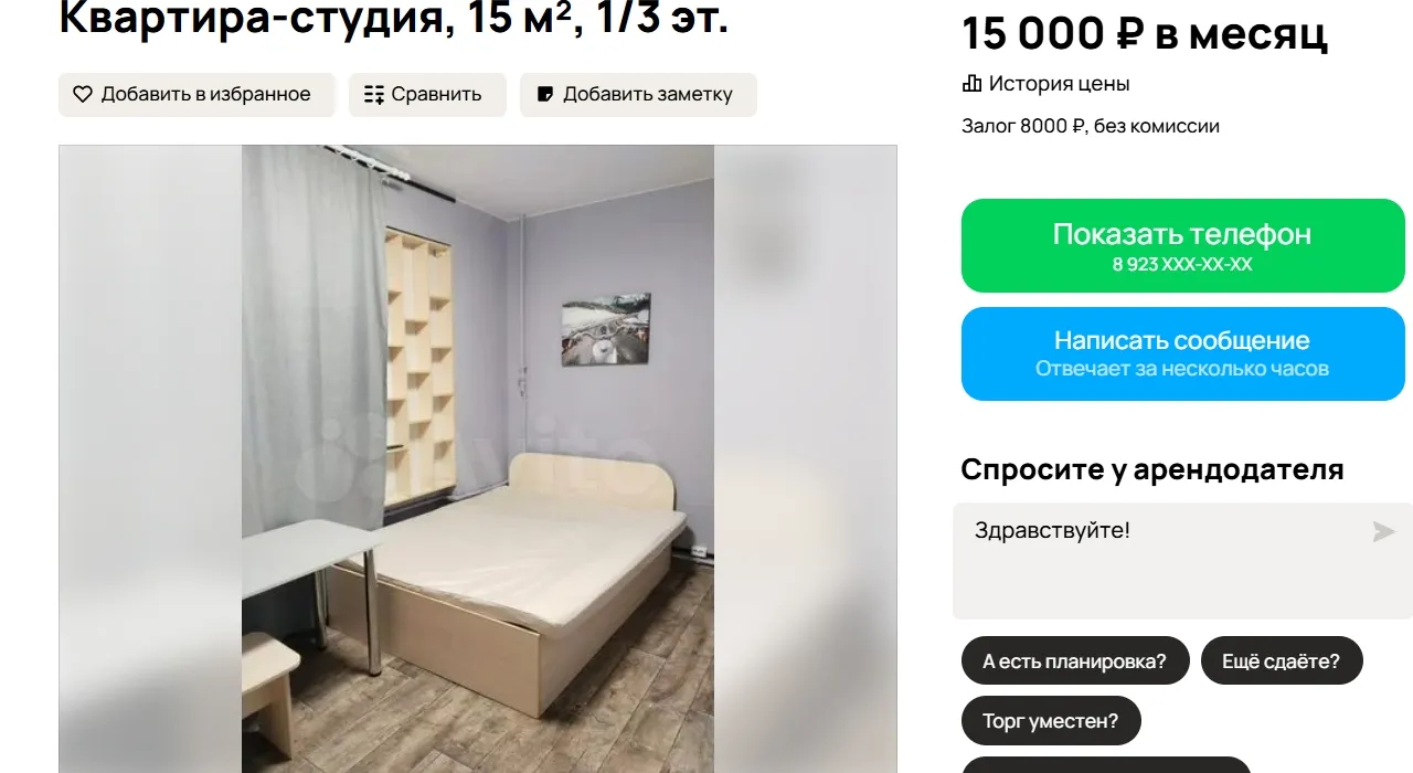 По данным аналитиков Restate, средняя стоимость аренды однокомнатной квартиры в Ярославле составляет 25 тысяч рублей в месяц. Журналист Про Города промониторил сайты бесплатных объявлений по аренде жилья и на одном их них нашел квартиру за 15 тысяч рублей в месяц. За такую стоимость можно снять на месяц квартиру-студию площадью 15 квадратных метров.