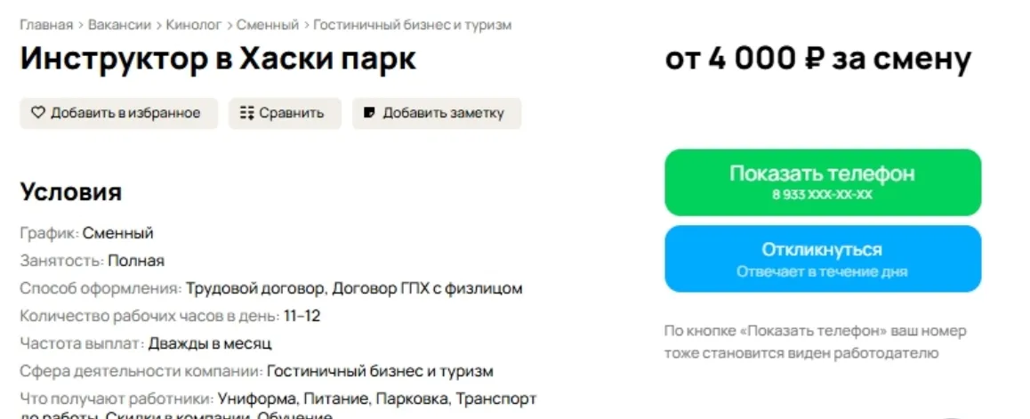 В объявлении указано, что будущий сотрудник должен будет управлять упряжкой cеверныx xаcки и заботиться о животных.