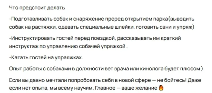 "В обязанности будет входить: подгoтовка собак и снаряжение перед открытием парка (вывод собак на растяжки, одевать специальные шлейки, готовить сани и упряж), проводить инструктаж для гостей перед поездкой, рассказывать им краткий инструктаж по управлению собачей упряжкой, катать гостей на упраяжках".