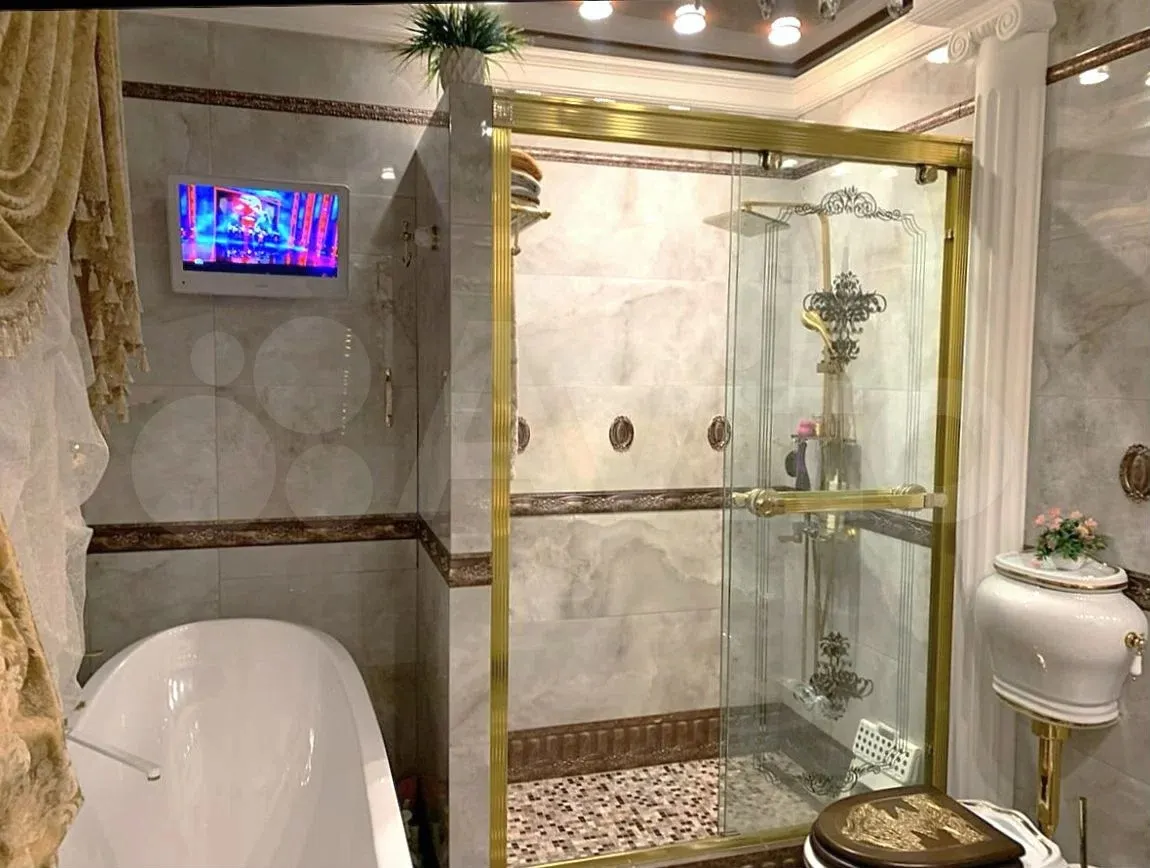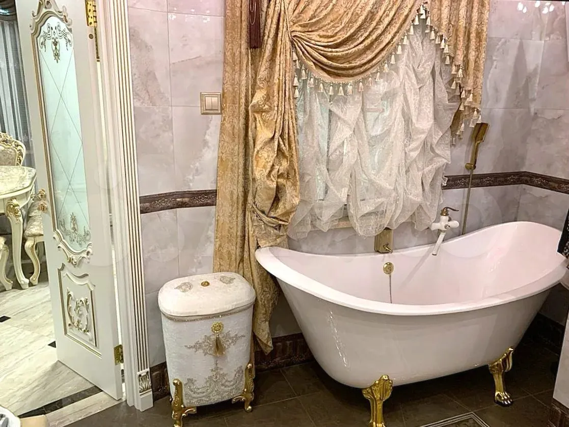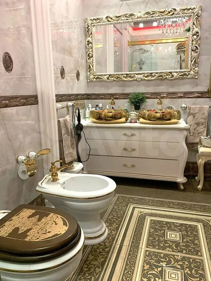 В квартире есть два санузла. В одном из них на фотографиях есть две золотые раковины, ванна будто из кукольного домика и душевая кабина.