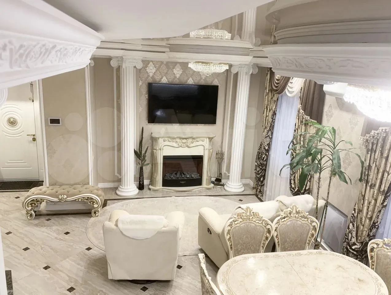 В гостиной, которая совмещена с кухней, расположены кожаные и бархатные диваны, камин и колонны в стиле барокко.