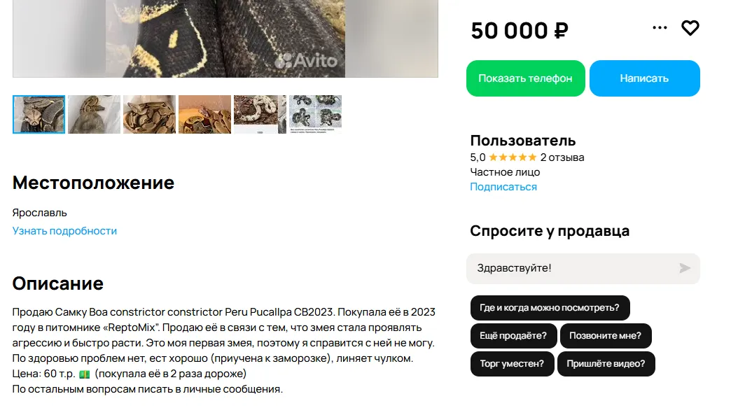 Девушка из Ярославля продает на Авито перуанского удава. Цена - 60 тысяч рублей (хотя в объявлении указано 50 тысяч).
