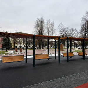 В сквере также поставили камеры видеонаблюдения, громкоговорители, новое освещение и даже модульный уличный туалет. И были установлены новые качели, лавочки и урны.