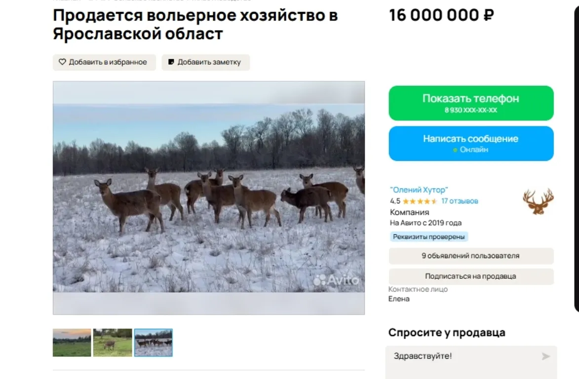 В Ярославле на Авито можно купить не только интересные вещи и домашних питомцев, но и целый бизнес. Так, журналист Про Города нашел объявление о продаже вольерного хозяйства с оленями и маралами. Цену за такой необычный лот назначили от 16 миллионов рублей.