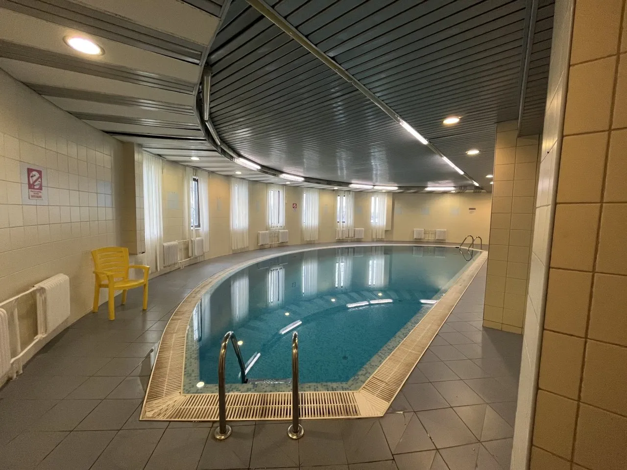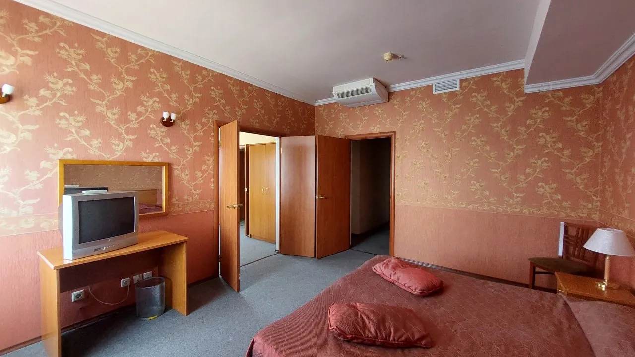 Отель продается вместе техникой и мебелью. Есть бассейн, бильярдные столы, лифт, кожаные диваны и даже выпуклый телевизор.