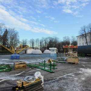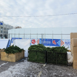 Монтажные работы ведутся активно. Уже привезли хоккейные ворота и залили каток, где будут проводиться матчи. Все готово к установке главной городской елки: она уже приехала в разобранном виде.