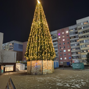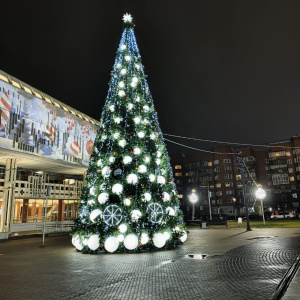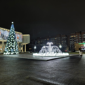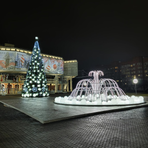 На площади Юности поставили новогоднюю ель, украшенную полусферами, и световой фонтан.