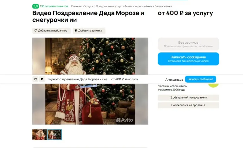 Такой формат подойдёт тем, кто хочет недорогой, но запоминающийся подарок — персональное видео для ребёнка. В ролике Дед Мороз и Снегурочка обращаются к ребёнку по имени, поздравляют и создают атмосферу волшебства. В стоимость входят: видеомонтаж, оживление фотографий, добавление текста, музыки, иногда — написание коротких сказок или песен. Цена растёт в зависимости от продолжительности и сложности ролика.
