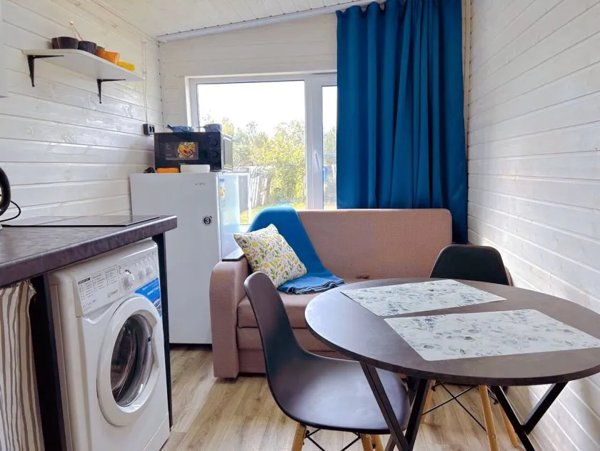 Есть отдельная спальня, оборудованная кухня (варочная поверхность, холодильник, микроволновка, чайник, посуда и приборы), санузел с душем, телевизор, стиральная машина, фен, бесплатная парковка на огороженной территории. Фишки — инфракрасная сауна в доме (от 1500 рублей сверху к проживанию) и мангальная зона. Размещение с питомцами — по договорённости, около 500 рублей. Цена: от 3 500 рублей в сутки, без учёта новогодней наценки.